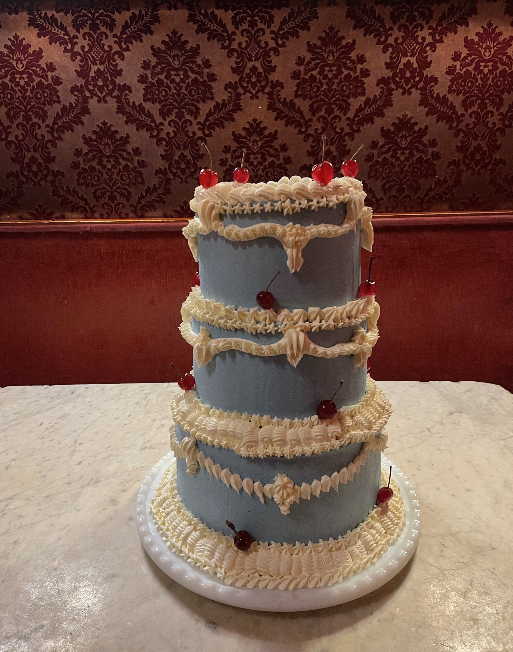 Eine dreistöckige Hochzeitstorte - Himbeer-Mohn und Schokolade - in hellblau mit weißer Buttercreme üppig verziert - wie für Marie-Antoinette. Dieses Großprojekt im Tanzcafé Jenseits perfekt in Szene gesetzt.